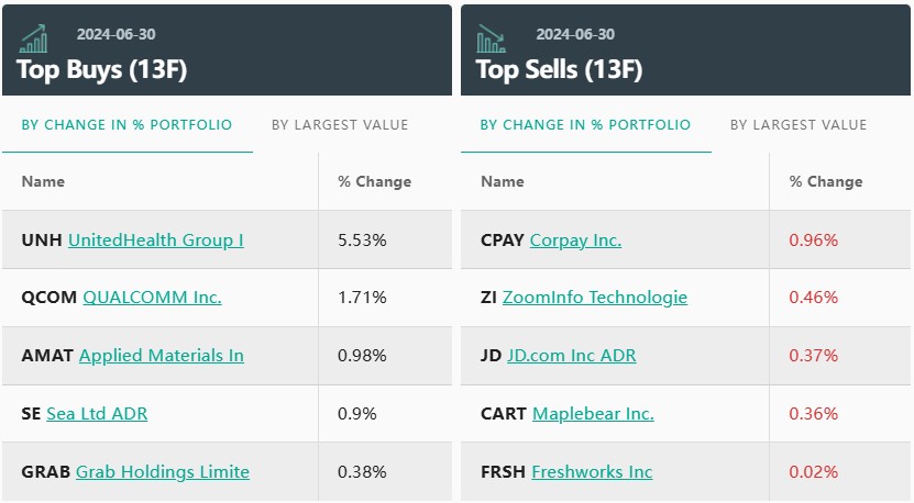 老虎环球在第二季度建仓联合健康、高通(QCOM.US)、应用材料(AMAT.US)、震坤行(ZKH.US)、Rubrik(RBRK.US),同时清仓了Freshworks(FRSH.US)、Instacart。