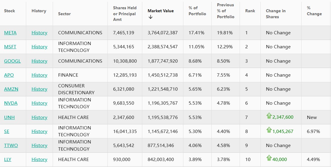 Meta(META.US)位列第一,持仓约747万股,持仓市值约为38亿美元,占投资组合比例为17.41%。
